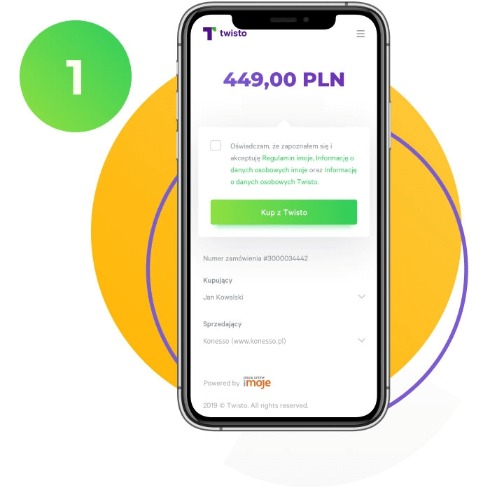 W koszyku przy wyborze formy płatności wybierz Twisto i dokończ składanie zamówienia. Po uzyskaniu pozytywnej weryfikacji, kliknij "Kup z Twisto".