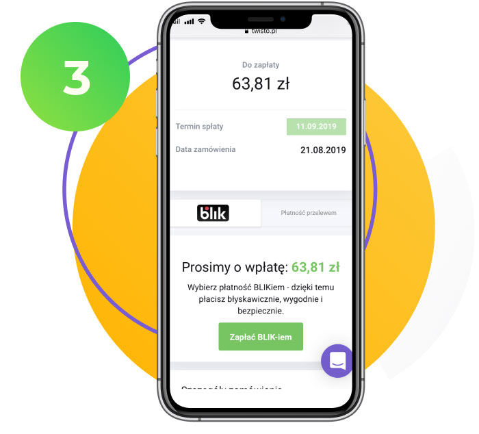 Opłatę za zamówienie należy wykonać nie do sklepu, a do Twisto. Możesz zrobić to w wygodny sposób BLIKIEM lub przelewem.